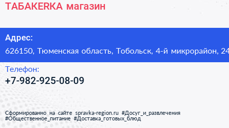 ТАБАКЕRКА, магазин по адресу 626150, Тюменская область, Тобольск, 4-й микрорайон, 24 в дальнейшем Организация, размещена в следующих категориях: