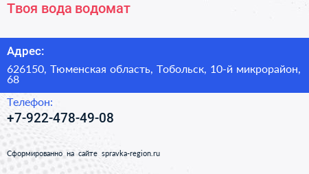 Твоя вода, водомат по адресу 626150, Тюменская область, Тобольск, 10-й микрорайон, 68 в дальнейшем Организация, размещена в следующих категориях: