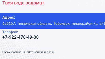 Твоя вода, водомат по адресу 626157, Тюменская область, Тобольск, микрорайон 7а, 2/1 в дальнейшем Организация, размещена в следующих категориях: