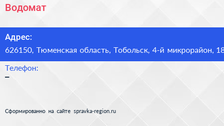 Водомат по адресу 626150, Тюменская область, Тобольск, 4-й микрорайон, 18 в дальнейшем Организация, размещена в следующих категориях: