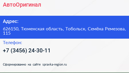 АвтоОригинал по адресу 626150, Тюменская область, Тобольск, Семёна Ремезова, 115 в дальнейшем Организация, размещена в следующих категориях: