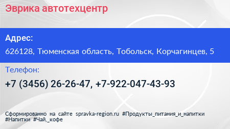 Эврика, автотехцентр по адресу 626128, Тюменская область, Тобольск, Корчагинцев, 5 в дальнейшем Организация, размещена в следующих категориях: