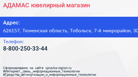 АДАМАС, ювелирный магазин по адресу 626157, Тюменская область, Тобольск, 7-й микрорайон, 30 в дальнейшем Организация, размещена в следующих категориях: