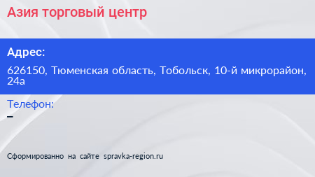 Азия, торговый центр по адресу 626150, Тюменская область, Тобольск, 10-й микрорайон, 24а в дальнейшем Организация, размещена в следующих категориях: