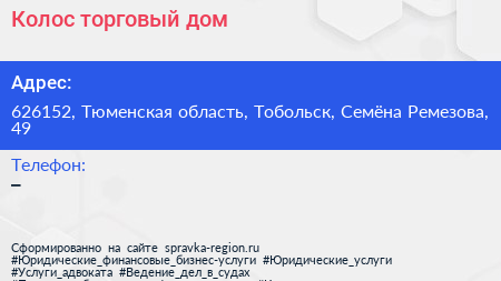 Колос, торговый дом по адресу 626152, Тюменская область, Тобольск, Семёна Ремезова, 49 в дальнейшем Организация, размещена в следующих категориях: