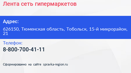 Лента, сеть гипермаркетов по адресу 626150, Тюменская область, Тобольск, 15-й микрорайон, 21 в дальнейшем Организация, размещена в следующих категориях: