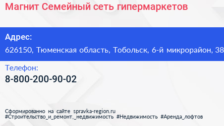 Магнит Семейный, сеть гипермаркетов по адресу 626150, Тюменская область, Тобольск, 6-й микрорайон, 38 в дальнейшем Организация, размещена в следующих категориях: