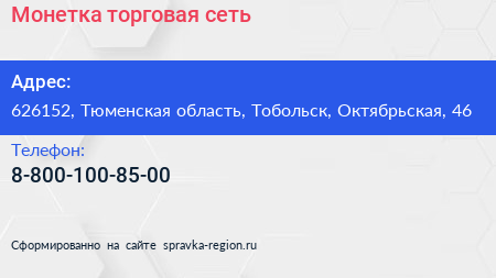 Монетка, торговая сеть по адресу 626152, Тюменская область, Тобольск, Октябрьская, 46 в дальнейшем Организация, размещена в следующих категориях: