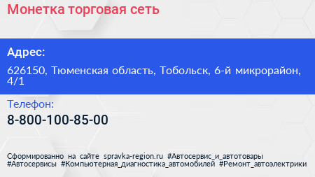 Монетка, торговая сеть по адресу 626150, Тюменская область, Тобольск, 6-й микрорайон, 4/1 в дальнейшем Организация, размещена в следующих категориях: