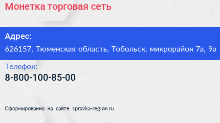 Монетка, торговая сеть по адресу 626157, Тюменская область, Тобольск, микрорайон 7а, 9а в дальнейшем Организация, размещена в следующих категориях: