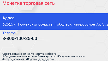 Монетка, торговая сеть по адресу 626157, Тюменская область, Тобольск, микрорайон 7а, 39д в дальнейшем Организация, размещена в следующих категориях: