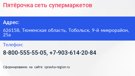 Пятёрочка, сеть супермаркетов по адресу 626158, Тюменская область, Тобольск, 9-й микрорайон, 25а в дальнейшем Организация, размещена в следующих категориях: