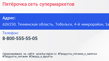 Пятёрочка, сеть супермаркетов по адресу 626150, Тюменская область, Тобольск, 4-й микрорайон, 1а в дальнейшем Организация, размещена в следующих категориях: