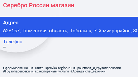 Серебро России, магазин по адресу 626157, Тюменская область, Тобольск, 7-й микрорайон, 30 в дальнейшем Организация, размещена в следующих категориях: