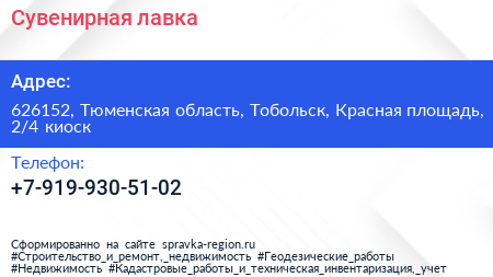Сувенирная лавка по адресу 626152, Тюменская область, Тобольск, Красная площадь, 2/4 киоск в дальнейшем Организация, размещена в следующих категориях: