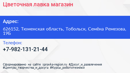 Цветочная лавка, магазин по адресу 626152, Тюменская область, Тобольск, Семёна Ремезова, 19Б в дальнейшем Организация, размещена в следующих категориях: