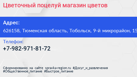 Цветочный поцелуй, магазин цветов по адресу 626158, Тюменская область, Тобольск, 9-й микрорайон, 15 в дальнейшем Организация, размещена в следующих категориях: