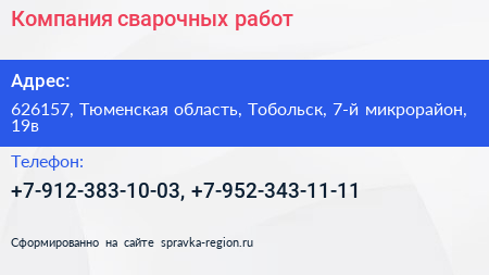 Компания сварочных работ по адресу 626157, Тюменская область, Тобольск, 7-й микрорайон, 19в в дальнейшем Организация, размещена в следующих категориях: