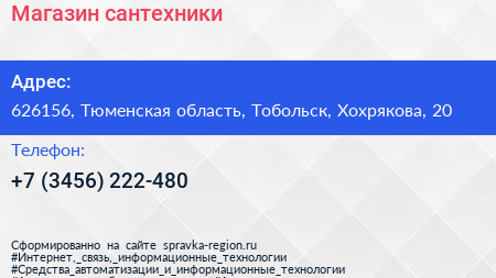Магазин сантехники по адресу 626156, Тюменская область, Тобольск, Хохрякова, 20 в дальнейшем Организация, размещена в следующих категориях: