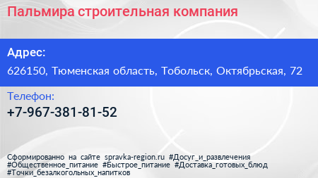 Пальмира, строительная компания по адресу 626150, Тюменская область, Тобольск, Октябрьская, 72 в дальнейшем Организация, размещена в следующих категориях:
