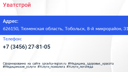 Уватстрой по адресу 626150, Тюменская область, Тобольск, 8-й микрорайон, 31 в дальнейшем Организация, размещена в следующих категориях: