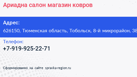 Ариадна, салон-магазин ковров по адресу 626150, Тюменская область, Тобольск, 8-й микрорайон, 38 в дальнейшем Организация, размещена в следующих категориях: