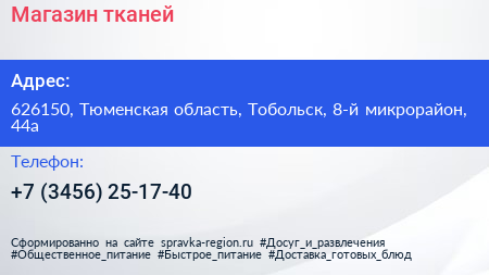 Магазин тканей по адресу 626150, Тюменская область, Тобольск, 8-й микрорайон, 44а в дальнейшем Организация, размещена в следующих категориях: