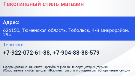 Текстильный стиль, магазин по адресу 626150, Тюменская область, Тобольск, 4-й микрорайон, 29а в дальнейшем Организация, размещена в следующих категориях: