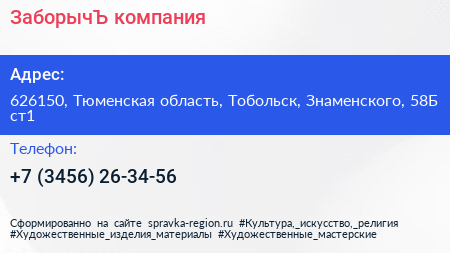 ЗаборычЪ, компания по адресу 626150, Тюменская область, Тобольск, Знаменского, 58Б ст1 в дальнейшем Организация, размещена в следующих категориях: