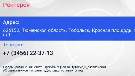 Рентерея по адресу 626152, Тюменская область, Тобольск, Красная площадь, 1 ст1 в дальнейшем Организация, размещена в следующих категориях: