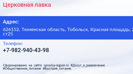 Церковная лавка по адресу 626152, Тюменская область, Тобольск, Красная площадь, 2 ст25 в дальнейшем Организация, размещена в следующих категориях: