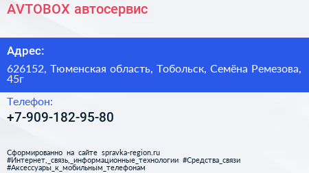 AVTOBOX, автосервис по адресу 626152, Тюменская область, Тобольск, Семёна Ремезова, 45г в дальнейшем Организация, размещена в следующих категориях: