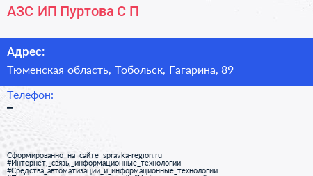 АЗС, ИП Пуртова С.П. по адресу Тюменская область, Тобольск, Гагарина, 89 в дальнейшем Организация, размещена в следующих категориях:
