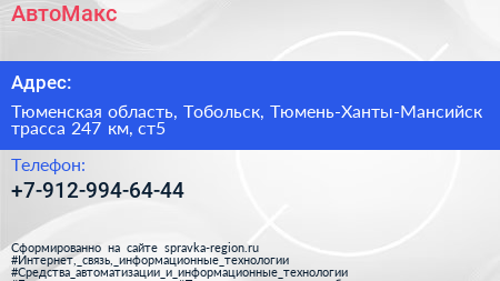 АвтоМакс по адресу Тюменская область, Тобольск, Тюмень-Ханты-Мансийск трасса 247 км, ст5 в дальнейшем Организация, размещена в следующих категориях:
