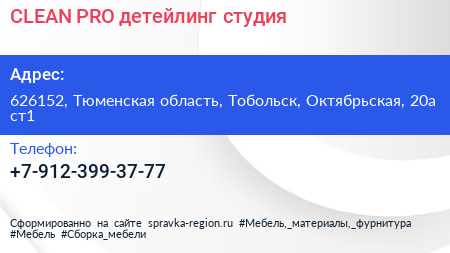 CLEAN PRO, детейлинг-студия по адресу 626152, Тюменская область, Тобольск, Октябрьская, 20а ст1 в дальнейшем Организация, размещена в следующих категориях: