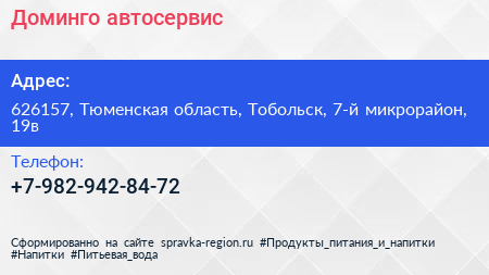 Доминго, автосервис по адресу 626157, Тюменская область, Тобольск, 7-й микрорайон, 19в в дальнейшем Организация, размещена в следующих категориях: