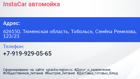 InstaCar, автомойка по адресу 626150, Тюменская область, Тобольск, Семёна Ремезова, 123/23 в дальнейшем Организация, размещена в следующих категориях: