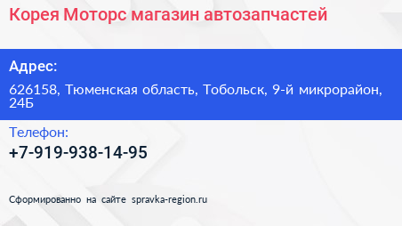 Корея Моторс, магазин автозапчастей по адресу 626158, Тюменская область, Тобольск, 9-й микрорайон, 24Б в дальнейшем Организация, размещена в следующих категориях: