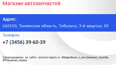 Магазин автозапчастей по адресу 626150, Тюменская область, Тобольск, 3-й квартал, 10 в дальнейшем Организация, размещена в следующих категориях:
