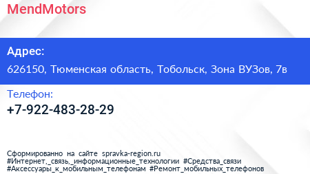 MendMotors по адресу 626150, Тюменская область, Тобольск, Зона ВУЗов, 7в в дальнейшем Организация, размещена в следующих категориях: