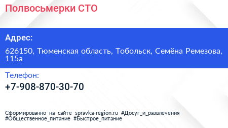 Полвосьмерки, СТО по адресу 626150, Тюменская область, Тобольск, Семёна Ремезова, 115а в дальнейшем Организация, размещена в следующих категориях: