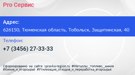 Pro Сервис по адресу 626150, Тюменская область, Тобольск, Защитинская, 40 в дальнейшем Организация, размещена в следующих категориях: