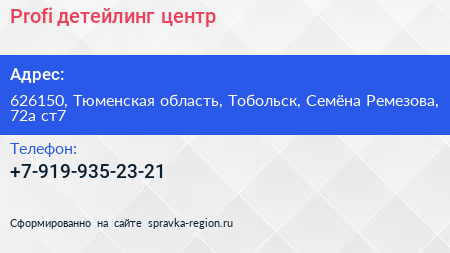 Profi, детейлинг-центр по адресу 626150, Тюменская область, Тобольск, Семёна Ремезова, 72а ст7 в дальнейшем Организация, размещена в следующих категориях:
