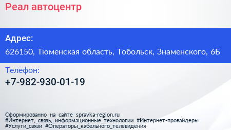 Реал, автоцентр по адресу 626150, Тюменская область, Тобольск, Знаменского, 6Б в дальнейшем Организация, размещена в следующих категориях: