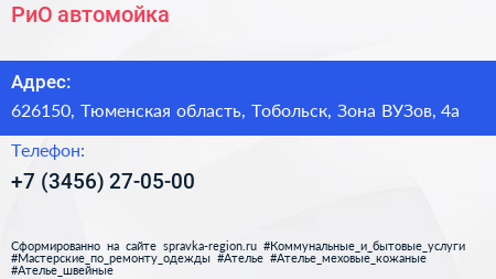РиО, автомойка по адресу 626150, Тюменская область, Тобольск, Зона ВУЗов, 4а в дальнейшем Организация, размещена в следующих категориях: