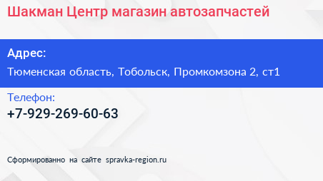 Шакман-Центр, магазин автозапчастей по адресу Тюменская область, Тобольск, Промкомзона 2, ст1 в дальнейшем Организация, размещена в следующих категориях: