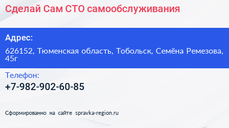 Сделай Сам, СТО самообслуживания по адресу 626152, Тюменская область, Тобольск, Семёна Ремезова, 45г в дальнейшем Организация, размещена в следующих категориях:
