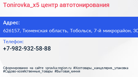 Tonirovka_x5, центр автотонирования по адресу 626157, Тюменская область, Тобольск, 7-й микрорайон, 30 в дальнейшем Организация, размещена в следующих категориях: