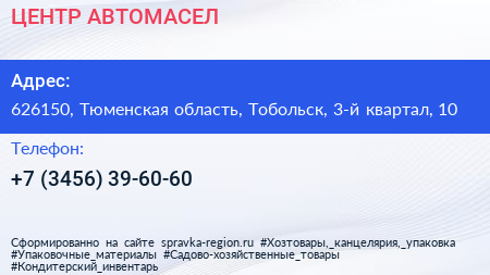 ЦЕНТР АВТОМАСЕЛ по адресу 626150, Тюменская область, Тобольск, 3-й квартал, 10 в дальнейшем Организация, размещена в следующих категориях: