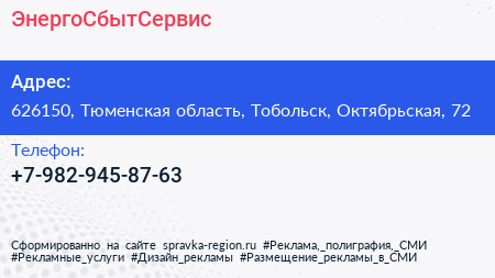 ЭнергоСбытСервис по адресу 626150, Тюменская область, Тобольск, Октябрьская, 72 в дальнейшем Организация, размещена в следующих категориях:
